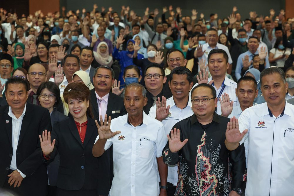 TIMBALAN Menteri di Jabatan Perdana Menteri (Undang-undang dan Reformasi Institusi) M. Kulasegaran (tiga, kiri) menunjukkan simbol ‘Antibuli’ bersama para peserta Townhall:Antibuli#GENERASITANPABULI Peringkat Negeri Sarawak hari ini. Foto BERNAMA