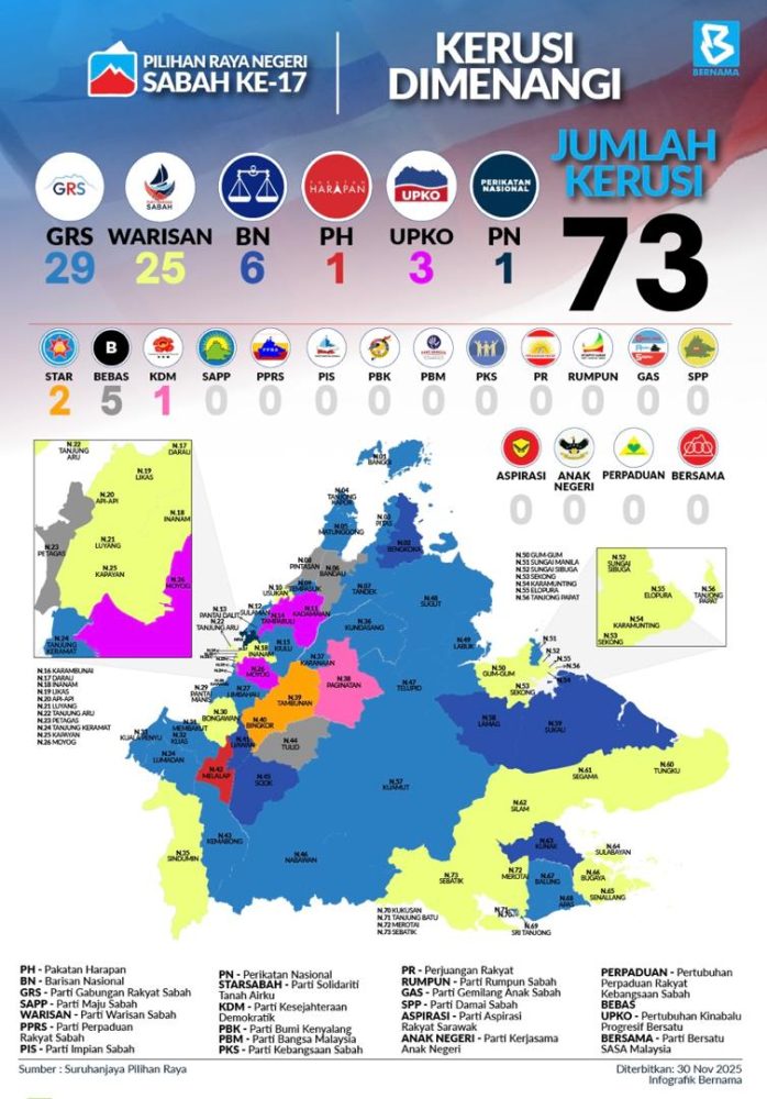 - GRS pimpinan Datuk Seri Hajiji Noor memperoleh 29 daripada 73 kerusi dewan. Saingan terdekat, Warisan pimpinan Datuk Seri Shafie Apdal mendapat 25 kerusi.