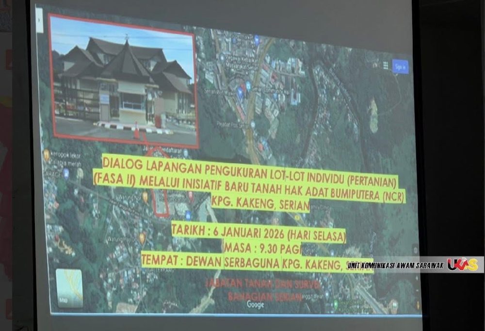 SERIAN: Usaha kerajaan Sarawak dalam memelihara serta mengiktiraf hak Tanah Adat Bumiputera (NCR) terus diperkasakan menerusi pelaksanaan Dialog Lapangan Pengukuran Lot Pertanian di bawah Inisiatif Baharu NCR yang berlangsung di Kampung Kakeng, di sini, hari ini.