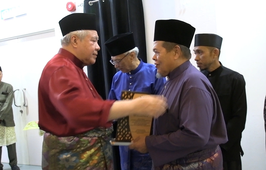 HARGAI SUMBANGAN…Awang Tengah kelihatan memeluk seorang Ketua Kampung daripada Awat-awat pada penyampaian sijil penghargaan atas jasa mereka.