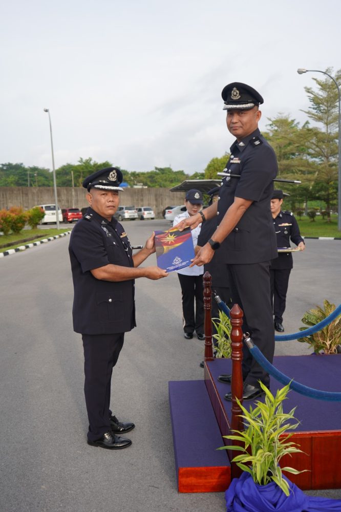 PEGAWAI dan anggota polis menghadiri Perhimpunan Bulanan di pekarangan IPD Bau bagi memperkukuhkan disiplin dan semangat berpasukan.