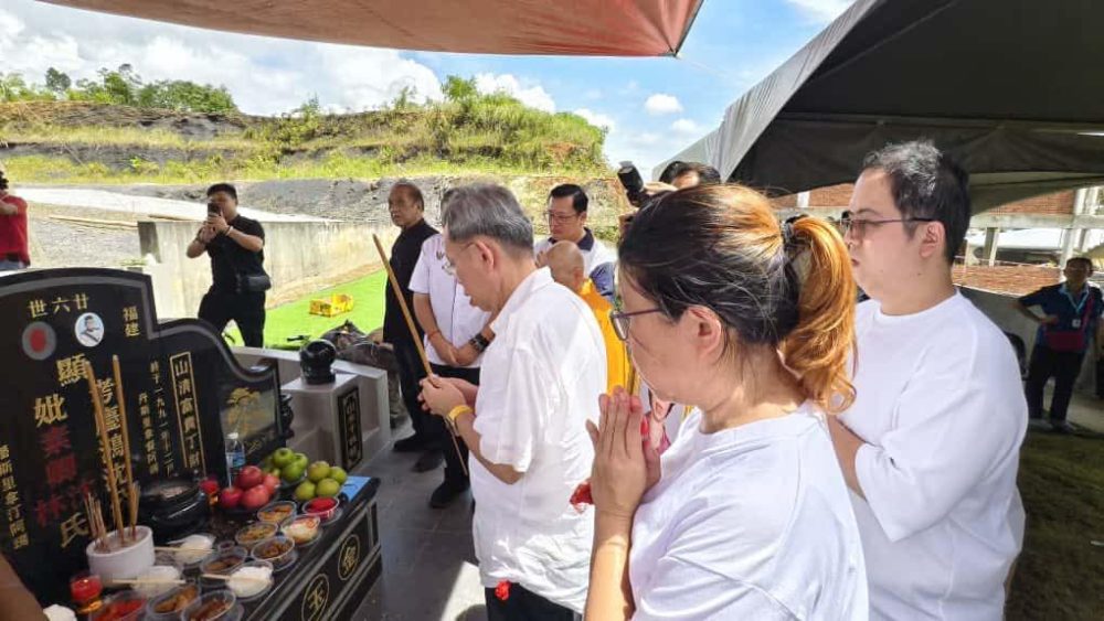 DR Sim dan ahli keluarganya sedang berdoa di pusara neneknya pada upacara pengebumian mendiang ibunya, Puan Sri Datin Amar Lim Su Kheng yang diadakan di sini, hari ini.