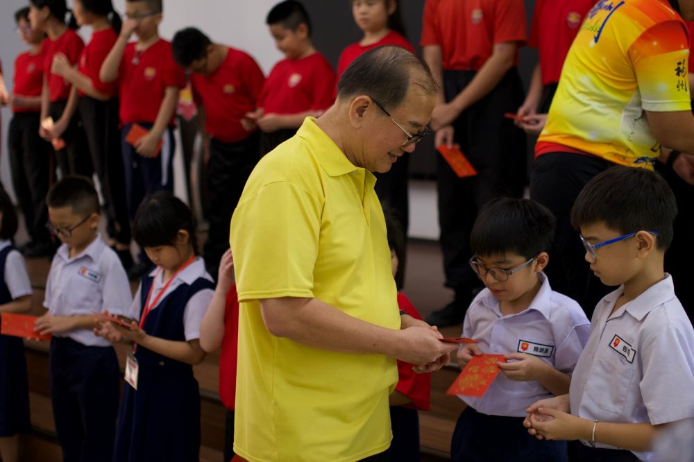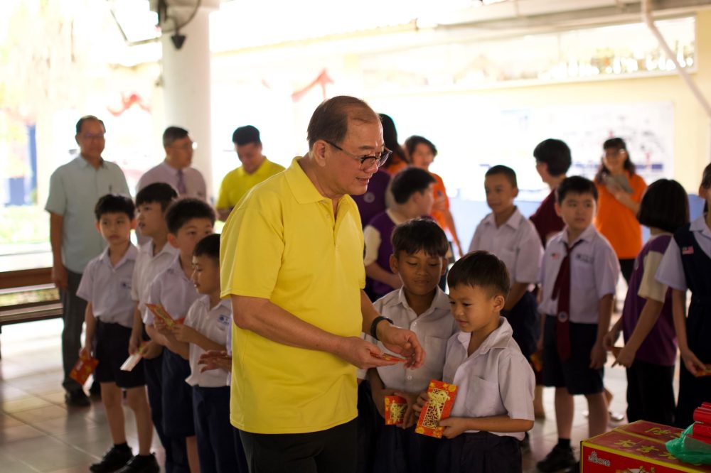 JOHNNY Pang menyampaikan sumbangan angpau kepada para murid sempena sambutan TBC anjuran Persatuan Foochow Bintulu.