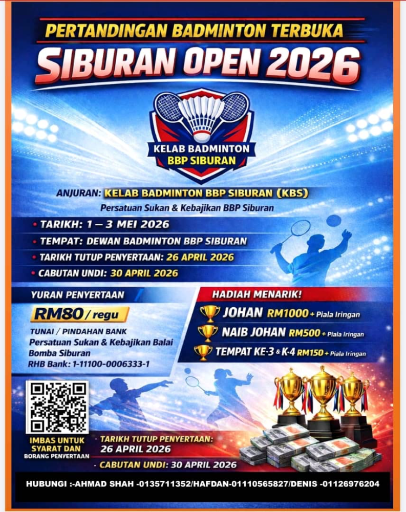 KUCHING: Peminat sukan badminton tempatan berpeluang mempamerkan bakat apabila Pertandingan Badminton Terbuka Siburan 2026 bakal berlangsung dari 1 hingga 3 Mei ini di Dewan Badminton Balai Bomba dan Penyelamat (BBP) Siburan.