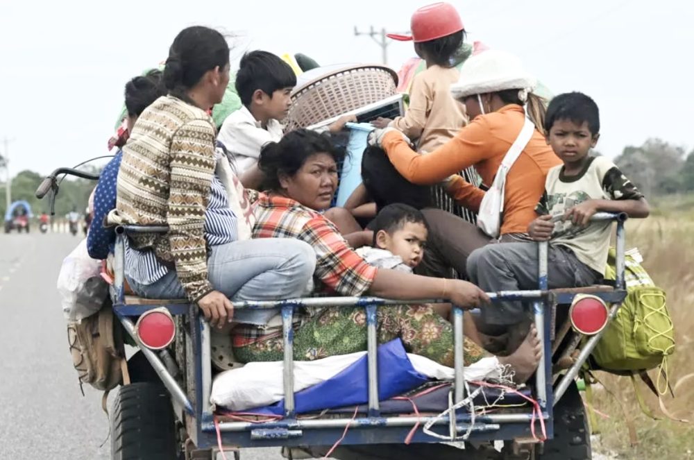 Penduduk yang dipindahkan membawa barangan mereka ketika meninggalkan kawasan di sepanjang sempadan Kemboja–Thailand di wilayah Siem Reap, Kemboja. Foto AFP