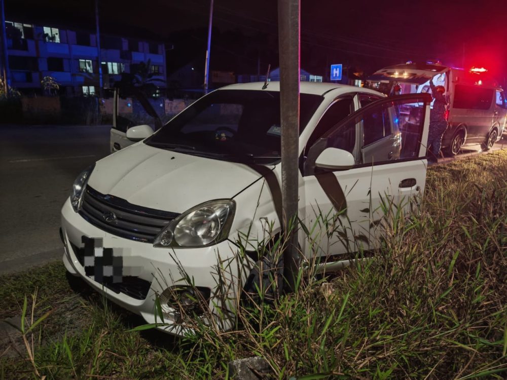 KERETA dipandu pesara terbabit hilang kawalan sebelum merempuh tiang lampu.