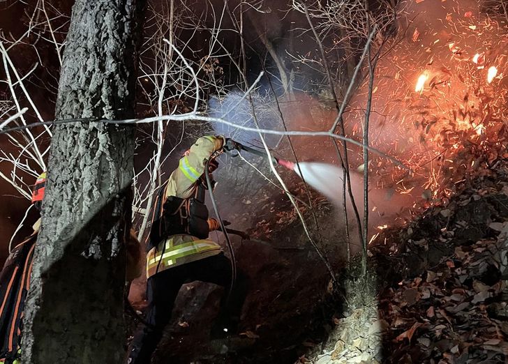 ANGGOTA bomba berusaha memadamkan kebakaran hutan selepas sebuah jet pejuang Tentera Udara Korea Selatan terhempas ke kawasan gunung di Yeongju, Wilayah Gyeongsang Utara, hari ini. Foto AGENSI.