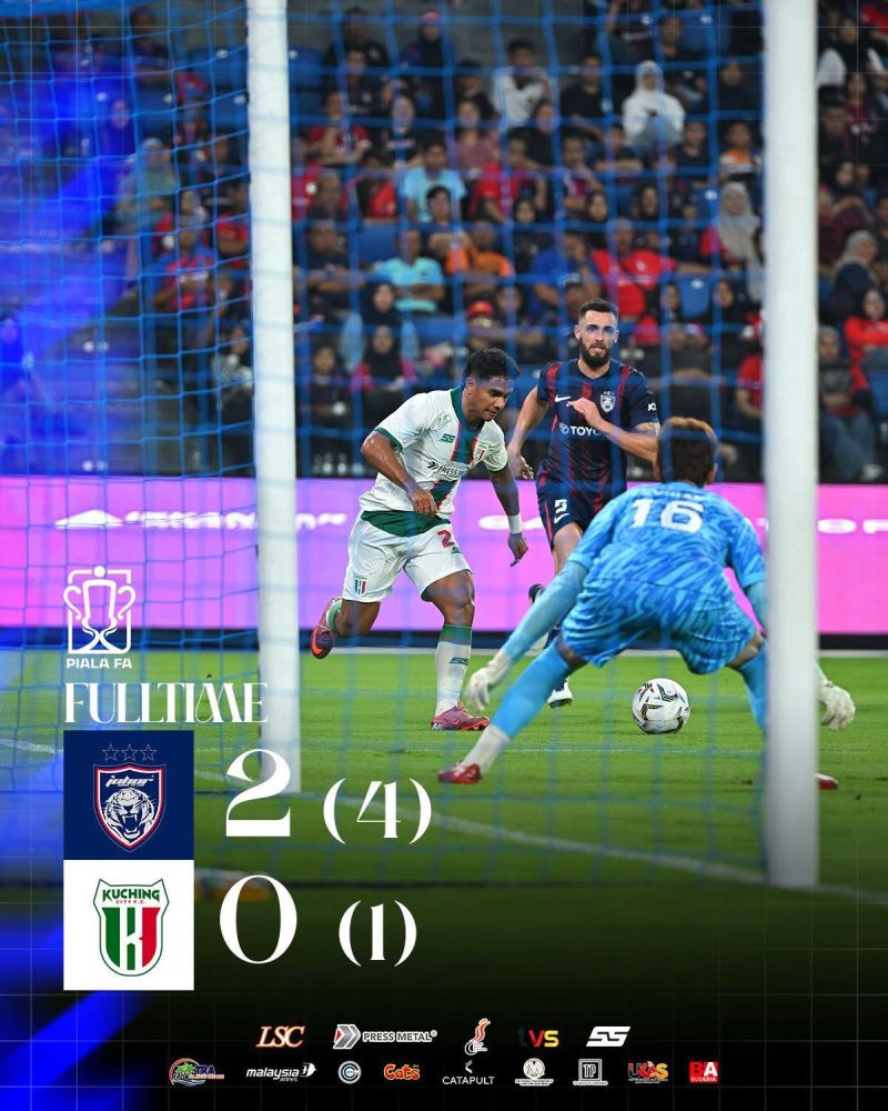 JOHOR BAHRU: Perjalanan Kuching City FC (KCFC) dalam kempen Piala FA berakhir susulan kekalahan 0-2 di tangan JDT FC dalam aksi timbal balik di Stadium Sultan Ibrahim malam ini.