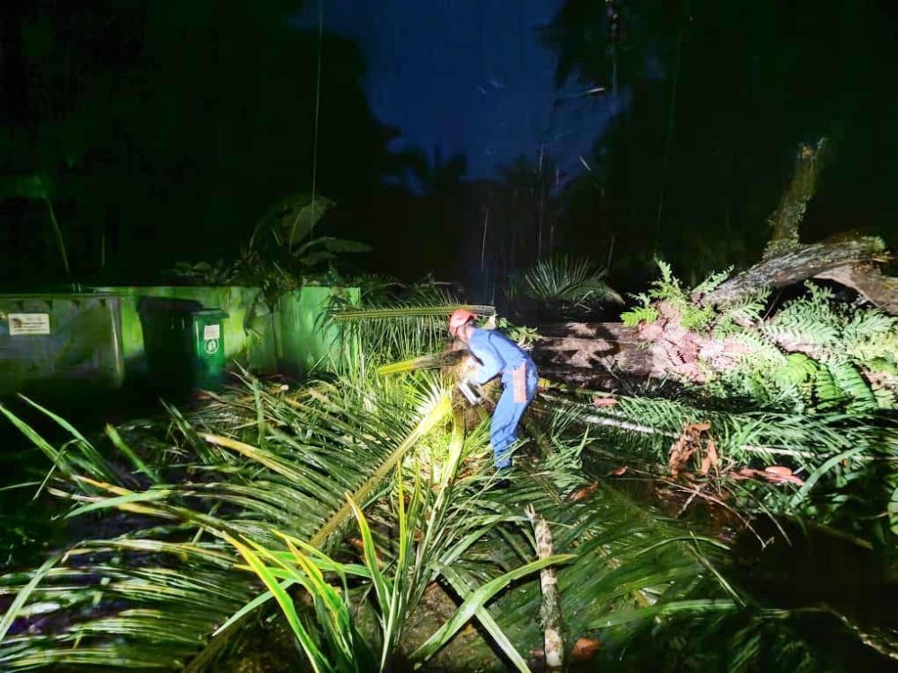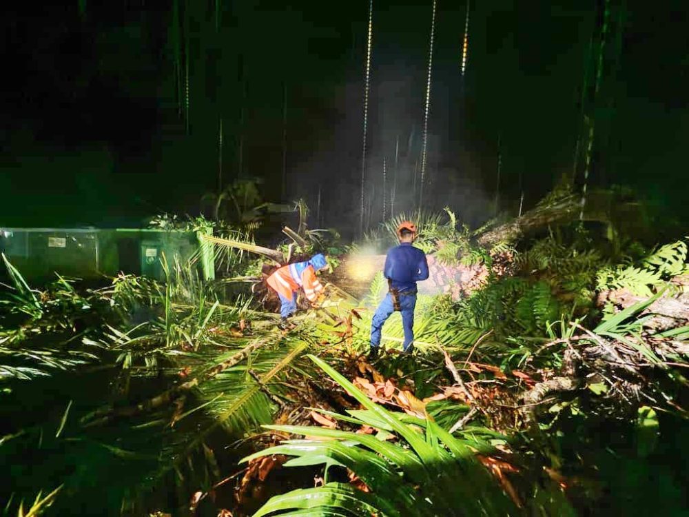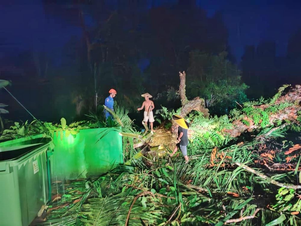 “Pemeriksaan mendapati pokok engkabang setinggi kira-kira 80 kaki dan pokok sawit setinggi 20 kaki telah tumbang sepenuhnya menutup jalan menuju ke sekolah dan klinik berkenaan,” katanya dalam kenyataan hari ini.