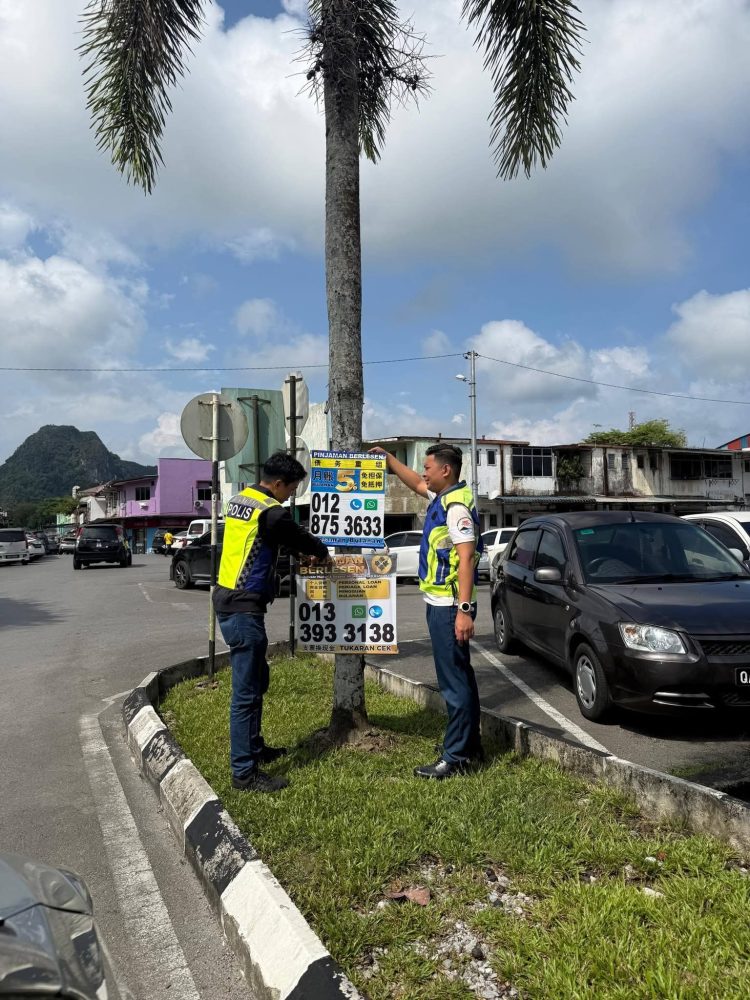ANGGOTA polis menurunkan sepanduk haram memaparkan nombor telefon along dalam operasi di sekitar bandar dan kawasan perumahan di Bau.