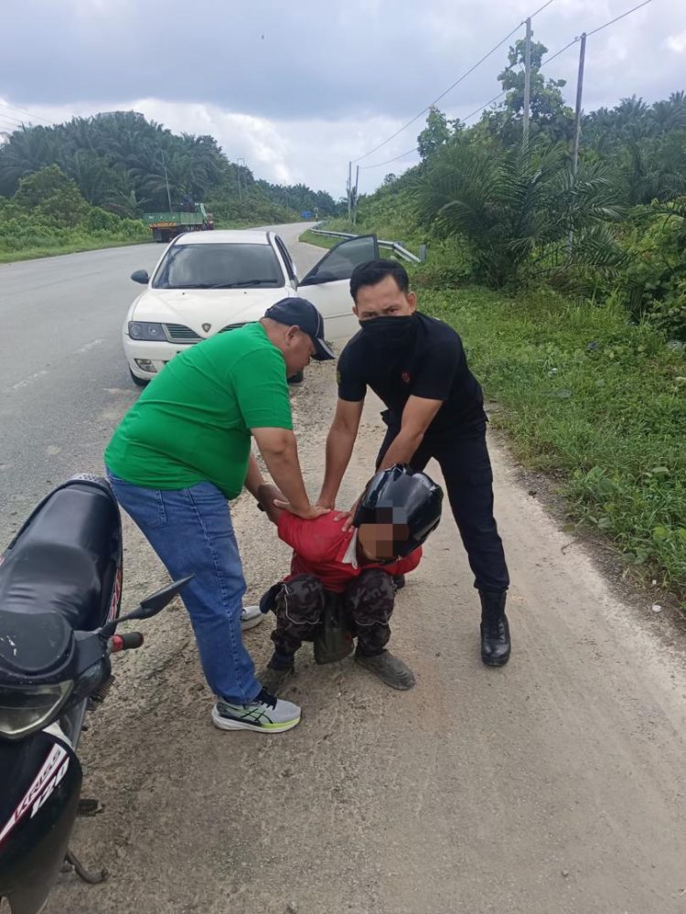 SEORANG lelaki ditahan selepas disyaki terlibat dalam aktiviti penyalahgunaan dadah dalam satu operasi di Jalan Mukah–Selangau. Foto PDRM