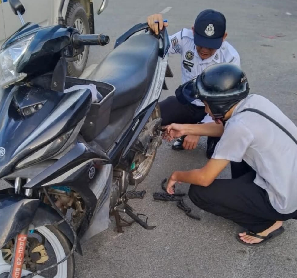 Sempena Op Selamat 25 Tahun Baru Cina 2026 yang bermula dari 15 hingga 20 Februari, anggota polis trafik menemui sebuah motosikal awam yang mengalami kerosakan akibat putus rantai berhampiran Pasaraya Lepapa, KM2, Jalan Lawas–Merapok.