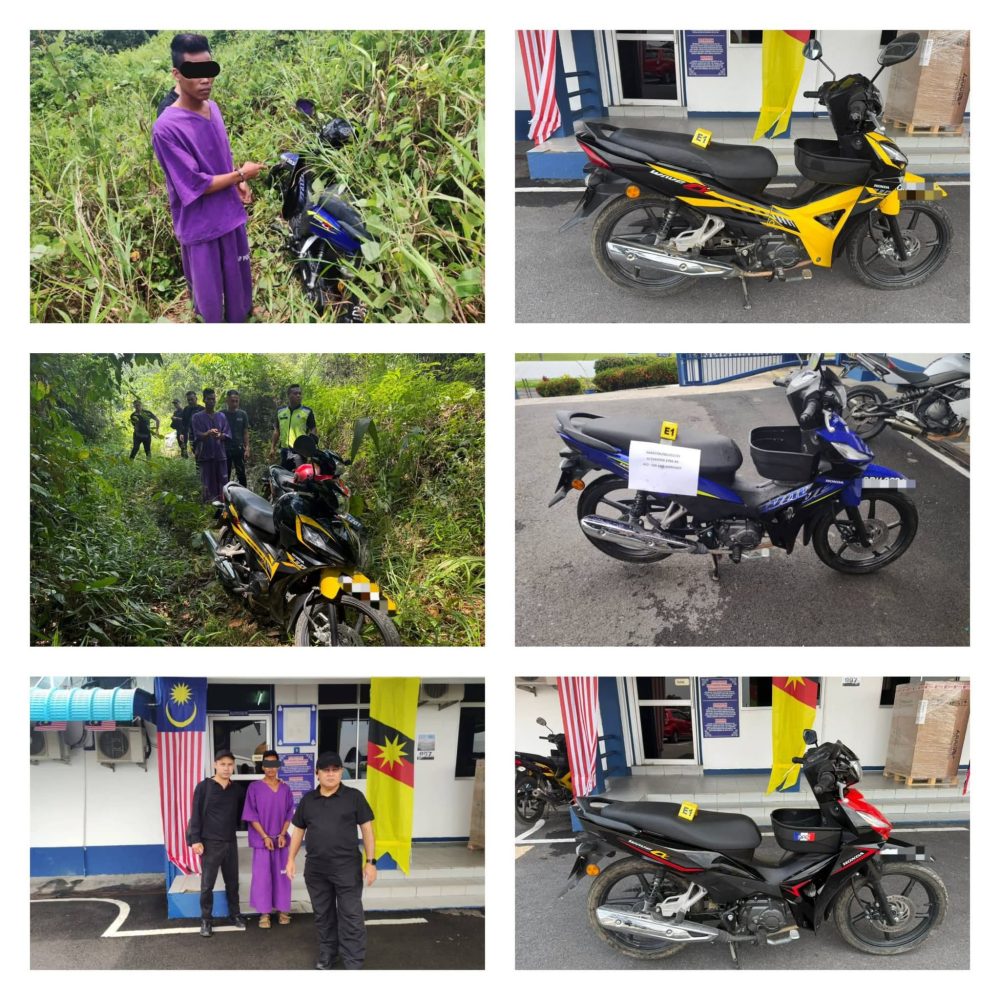 “Suspek mengaku terlibat dalam kes kecurian tiga buah motosikal di kawasan parkir motosikal awam, luar pagar Kilang Sawit Salcra, Nanga Melupa.