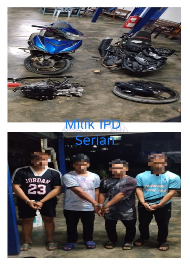 SERIAN: Polis menahan empat lelaki tempatan yang disyaki terlibat dalam kes kecurian motosikal di Kampung Tanah Puteh.