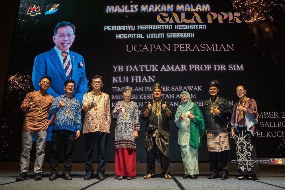 PENGERUSI MPP, Kaunselor Tan Kai, bersama barisan tetamu kehormat lain, memeriahkan Majlis Makan Malam Pembantu Perawatan Kesihatan Hospital Umum Sarawak. Foto UKAS