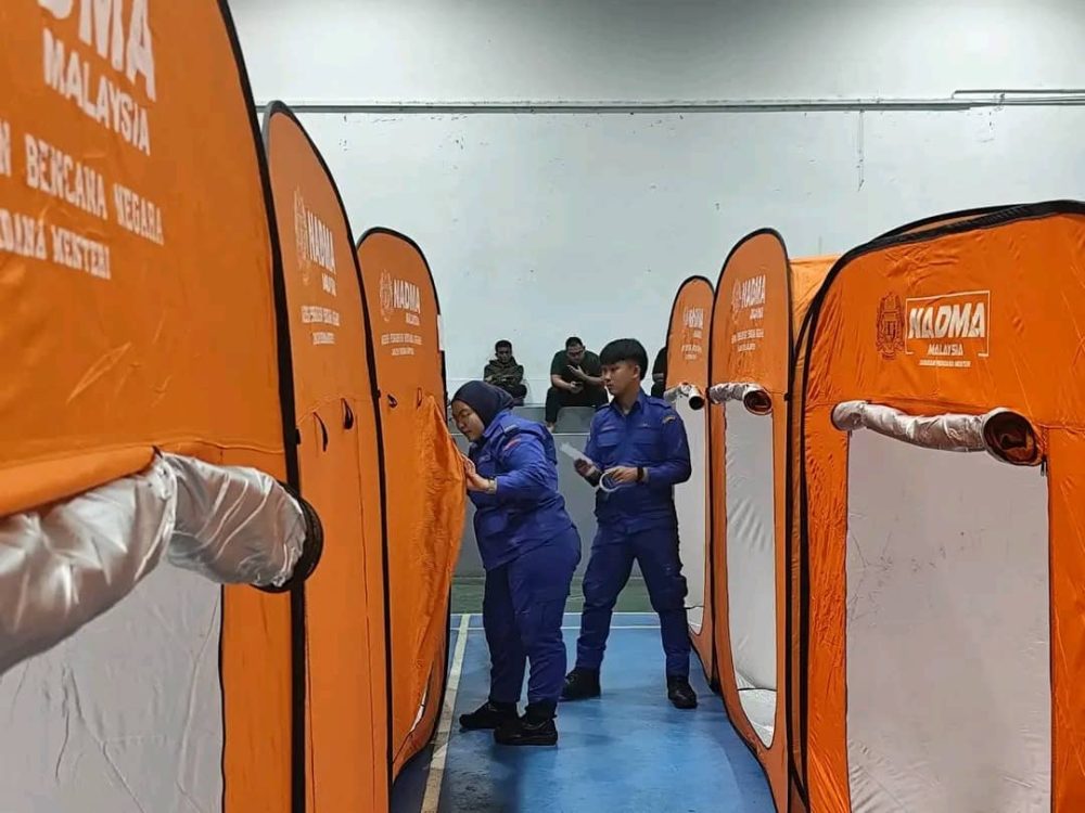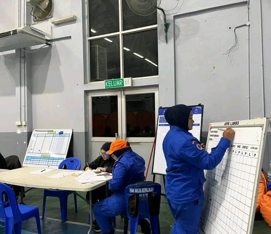 BUKA PPS… Anggota APM merekod nama mangsa yang dipindahkan di Dewan Masyarakat Trusan.