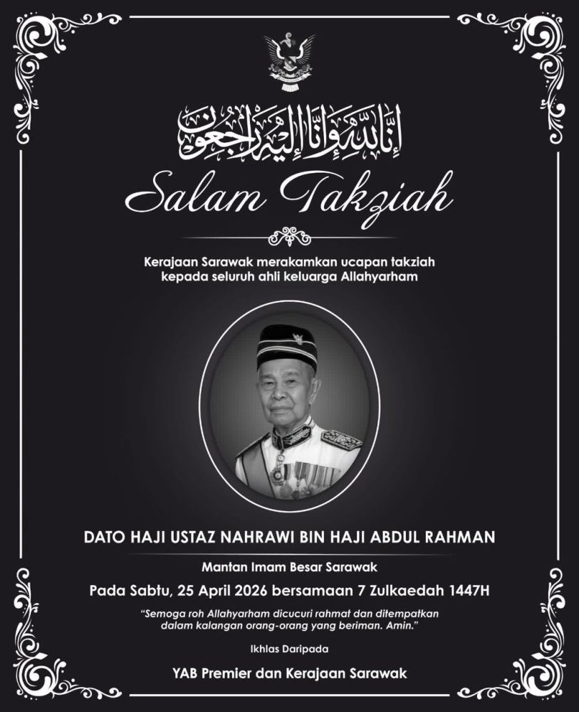 KUCHING: Premier Sarawak, Datuk Patinggi Tan Sri Abang Johari Tun Openg menzahirkan ucapan takziah kepada keluarga Allahyarham Dato Ustaz Nahrawi Abdul Rahman, bekas Imam Besar Sarawak yang telah kembali ke rahmatullah.