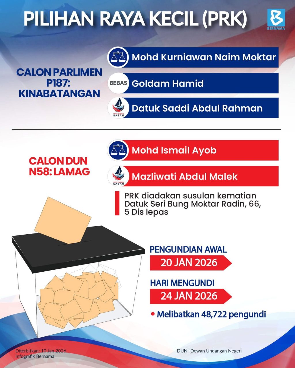 “Suruhanjaya Pilihan Raya (SPR) menerima kertas penamaan daripada tiga orang calon bagi kerusi Parlimen dan dua calon bagi kerusi DUN bagi bahagian pilihan raya P187 Kinabatangan dan N58 Lamag.