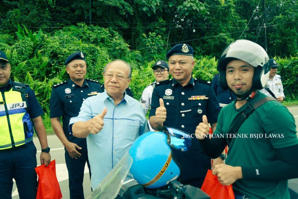 BERHATI-HATI… Ahli Parlimen Lawas, Dato Henry Sum Agong diiring Ketua Polis Daerah Lawas, DSP Liong Tindan menyampaikan risalah dan topi keledar kepada penunggang motosikal di Jalan Lawas-Trusan.