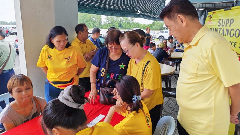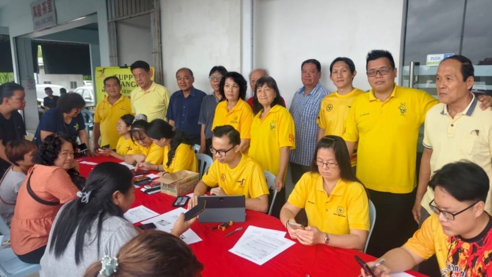 ADUN Meradong, Datuk Ding Koung Hiing bersama ahli-ahli SUPP Cawangan Bintangor menyantuni penduduk setempat yang hadir untuk mendapatkan bantuan. Foto Pusat Khidmat Meradong