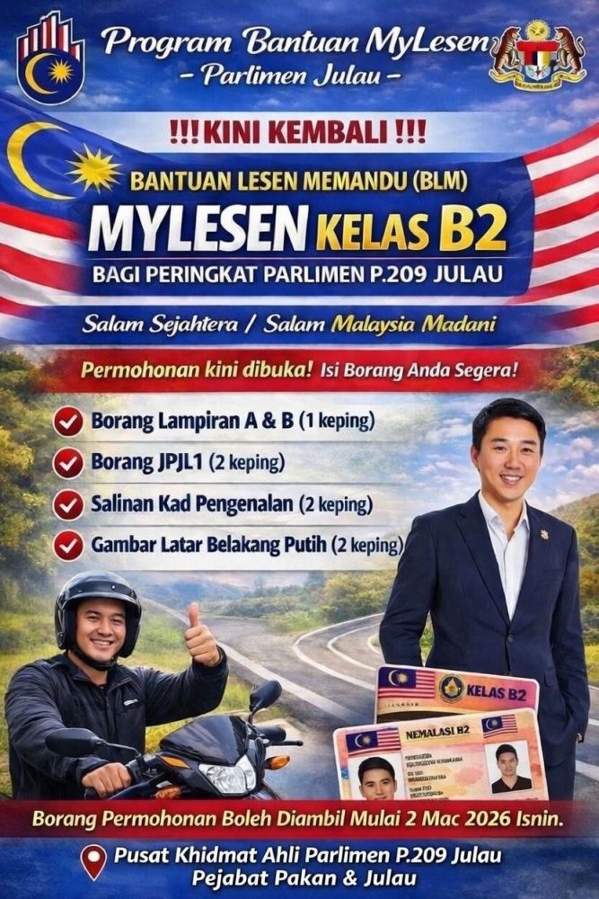 Ahli Parlimen Julau yang juga Pengerusi Lembaga Perindustrian Kayu Malaysia (MTIB), Datuk Larry Sng Wei Shien, berkata inisiatif tersebut diperkenalkan bagi membantu penduduk luar bandar, khususnya golongan belia, mendapatkan lesen motosikal secara sah melalui proses yang lebih mudah dan tersusun.