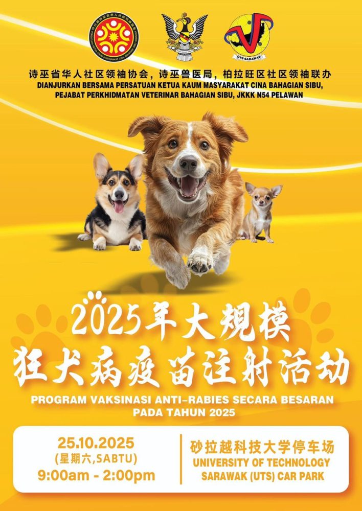 SIBU: Program vaksinasi anti rabies akan diadakan kawasan tempat letak kereta Universiti Teknologi Sarawak (UTS) bermula 9.00 pagi hingga 2.00 petang pada 25 Oktober ini.