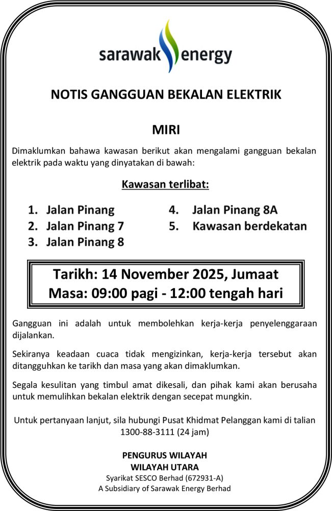 IKLAN Khamis, 13-14 November 2025, SEB Notis Gangguan Bekalan Elektrik Miri (Jln Pinang-Hifix) Utusan Sarawak 17 hours ago Continue Reading Next: Khamis 13-14 November 2025, SEB Notis Gangguan Bekalan Elektrik Miri (Jln Pinang)