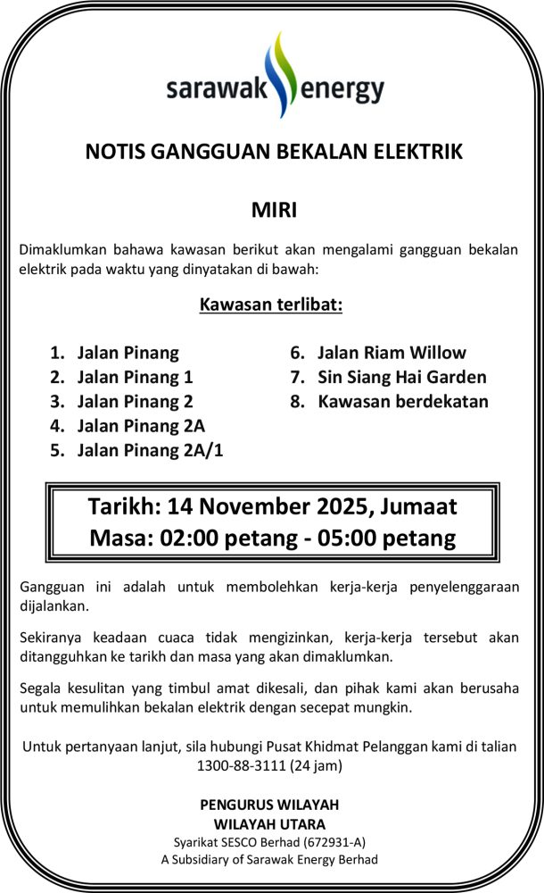 IKLAN Khamis 13-14 November 2025, SEB Notis Gangguan Bekalan Elektrik Miri (Jln Pinang) Utusan Sarawak 15 hours ago Continue Reading Previous: Khamis, 13-14 November 2025, SEB Notis Gangguan Bekalan Elektrik Miri (Jln Pinang-Hifix)Next: Khamis, 13-14 November, 2025 SEB Notis Gangguan Bekalan Elektrik Lundu