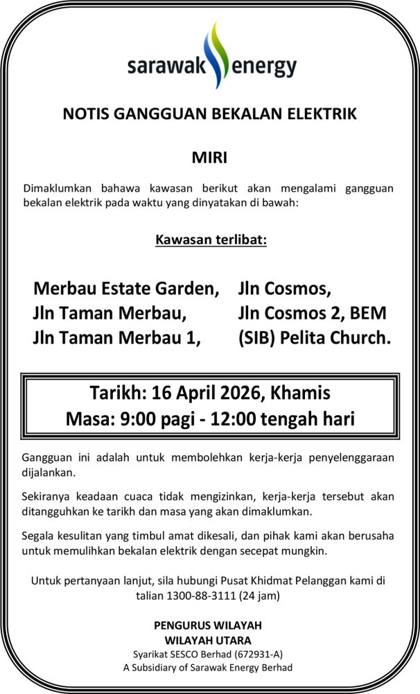 IKLAN Rabu, 15-16 April 2026, SEB Notis Gangguan Bekalan Elektrik Miri (Merbau Estate) Utusan Sarawak 5 hours ago Continue Reading Previous: Rabu,15 April 2026, Lembaga Boya Dan Api Sarawak, Notis Tender (Bekalan / Perkhidmatan)Next: Rabu, 15-16 April 2026, SEB Notis Gangguan Bekalan Elektrik Miri (Tudan)