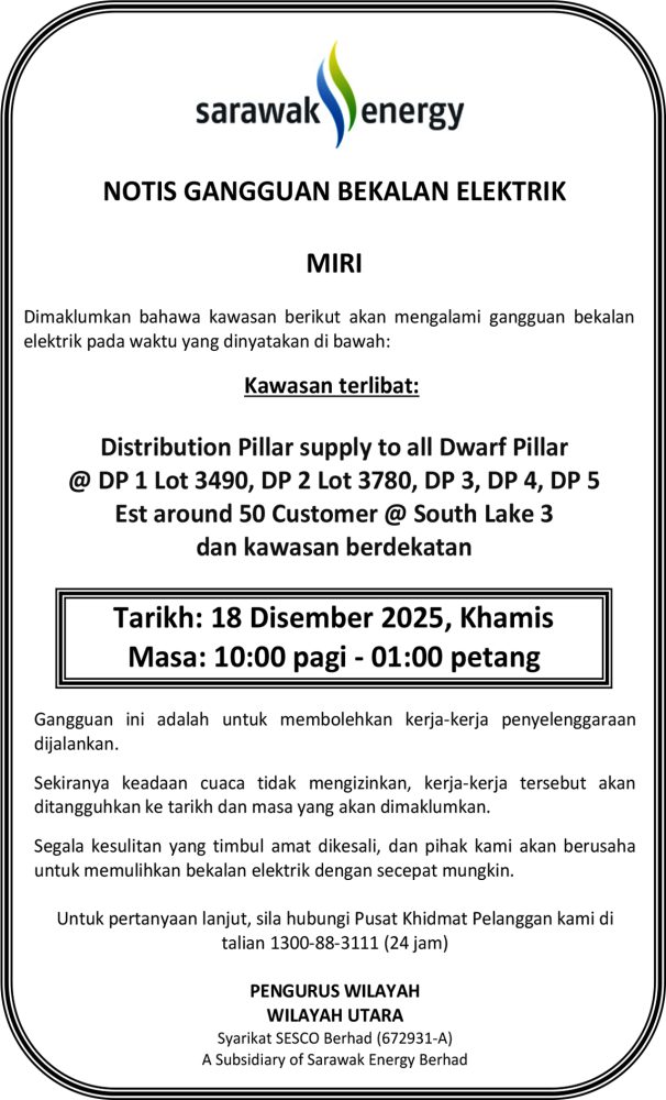 IKLAN Rabu, 17-18 Disember 2025, SEB Notis Gangguan Bekalan Elektrik Miri (South Lake) Utusan Sarawak 10 hours ago Continue Reading Previous: Selasa, 16 Disember 2025, Majlis Daerah Limbang, RETENDER, Kenyataan Tender (Daerah Limbang Sahaja)Next: Rabu, 17 Disember 2025, Majlis Daerah Subis, Kenyataan Tender