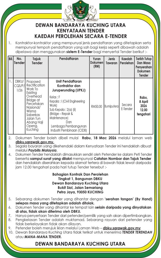 IKLAN Rabu, 18 Mac 2026, DBKU CQS_P_1_26 Kenyataan Tender Kaedah Perolehan Secara E-Tender Utusan Sarawak 9 hours ago Continue Reading Previous: Rabu, 18 Mac 2026, DBKU Kenyataan Tender, Kaedah Perolehan Secara E-TenderNext: Rabu, 18 Mac 2026, Majlis Daerah Limbang Kenyataan Sebutharga