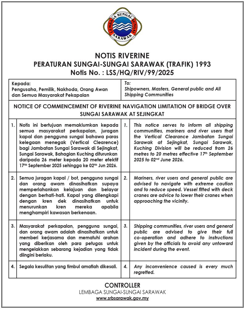 IKLAN Rabu, 19-20 November 2025, Lembaga Sungai-Sungai Sarawak, Notis Riverine Utusan Sarawak 7 hours ago Continue Reading Previous: Selasa, 18 November 2025, Condolence to Datuk Amar Dr Sim Kui Hian on the demise of his beloved mother, Puan Sri Datin Amar Lim Su Kheng from Dato & Datin Jonathan ChaiNext: Rabu, 19-20 November 2025, SEB Notis Gangguan Bekalan Elektrik Kuching