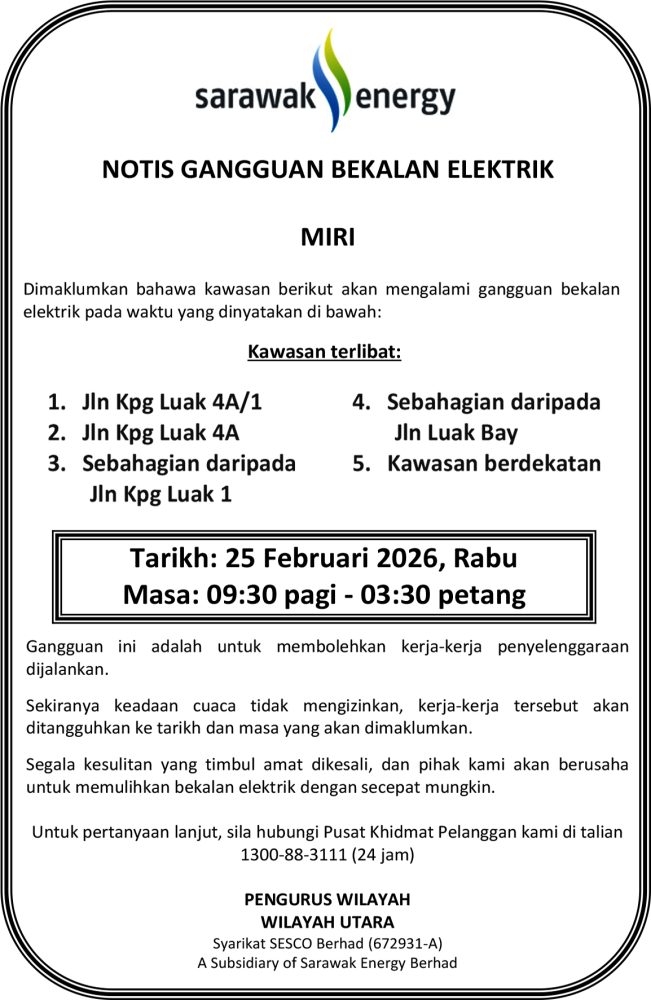 IKLAN Rabu, 25 Februari 2026, SEB Notis Gangguan Bekalan Elektrik Miri (Kg Luak) Utusan Sarawak 6 hours ago Continue Reading Previous: Kami mencari wartawan untuk kawasan Bintulu. Apakah anda berminat?Next: Rabu, 25 Februari 2026, DBKU_ CQS_P_ 10_26, Kenyataan Tender