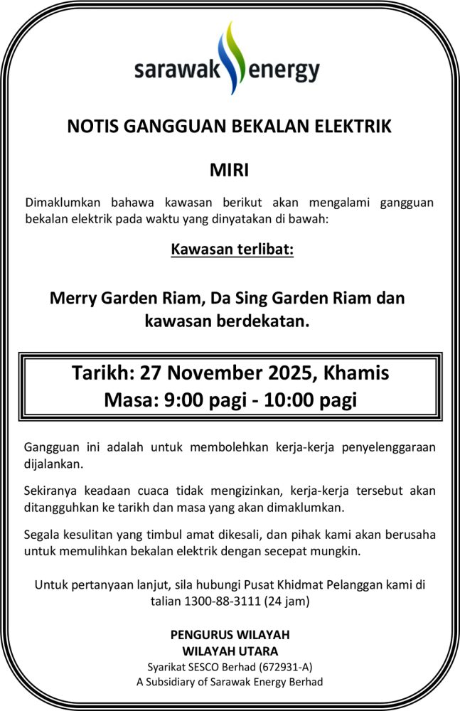 IKLAN Rabu, 26-27 November 2025, SEB Notis Gangguan Bekalan Elektrik Miri (Merry Garden Riam) Utusan Sarawak 7 hours ago Continue Reading Previous: Rabu, 26 November 2025, SEB Notis Gangguan Bekalan Elektrik Miri (Jln Aru)Next: Rabu, 26-27 November 2025, SEB Notis Gangguan Bekalan Elektrik Miri (Sibuti)