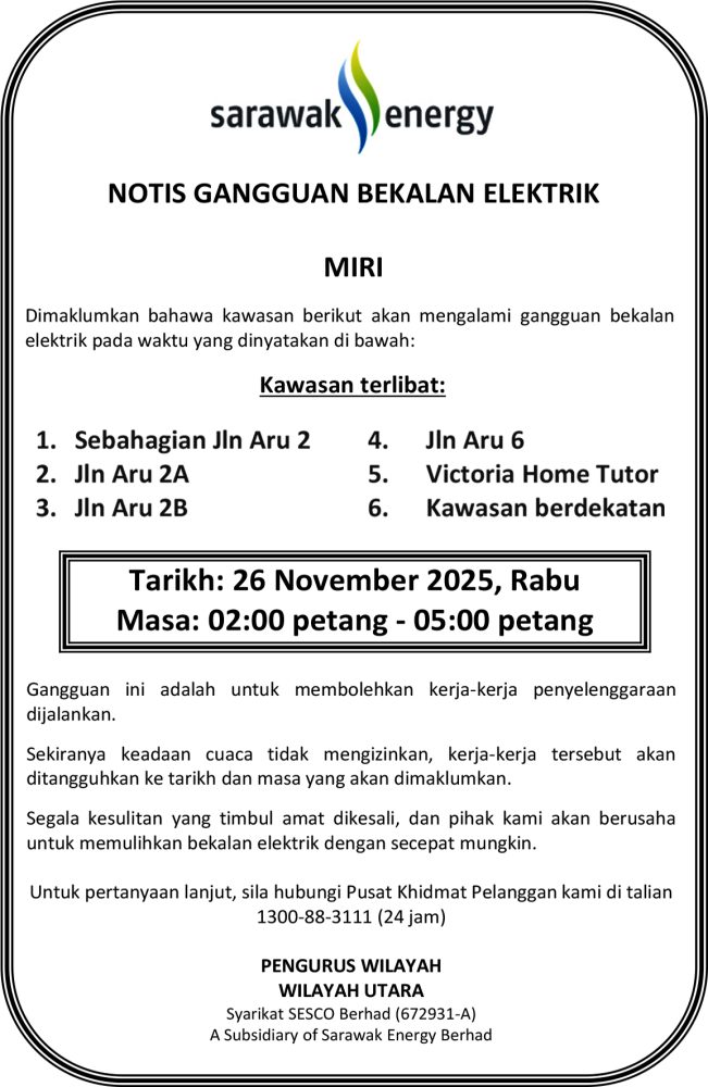 • Rabu, 26 November 2025, SEB Notis Gangguan Bekalan Elektrik Miri (Jln Aru)