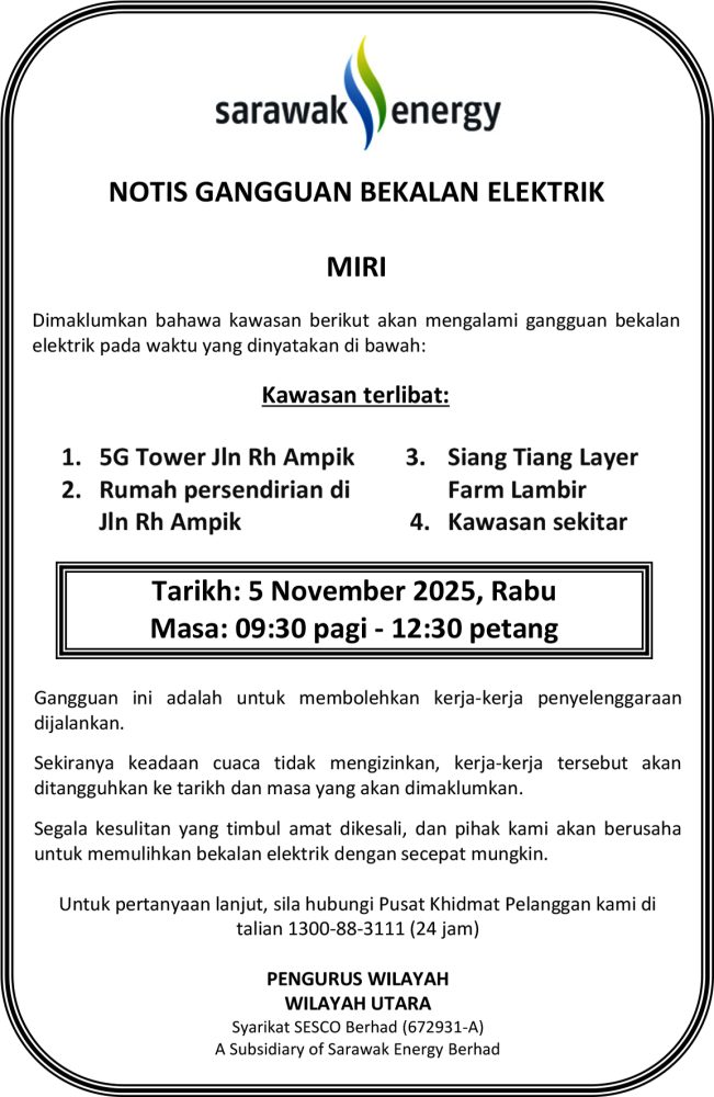 IKLAN Rabu, 5 November 2025, SEB Notis Gangguan Bekalan Elektrik Miri Utusan Sarawak 1 day ago Continue Reading Previous: Isnin, 3-4 November 2025, SEB Notis Gangguan Bekalan Elektrik Miri (Jln Ketapang)