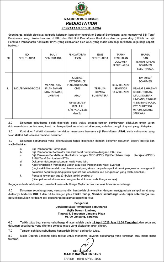 IKLAN Rabu, 8 April 2026, Majlis Daerah Limbang, Requotation, Kenyataan Sebutharga Utusan Sarawak 6 hours ago Continue Reading Previous: Rabu, 8 April 2026, Majlis Daerah Limbang, Kenyataan Tender