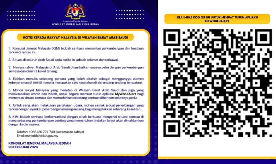 “Konsulat Jeneral Malaysia Jeddah sentiasa berkomunikasi dengan pihak berkuasa mengenai situasi semasa di mana sebarang perkembangan penting yang memerlukan tindakan lanjut akan dimaklumkan dengan kadar segera,” menurut notis itu.