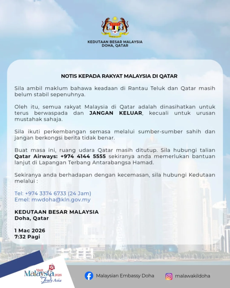 Kedutaan boleh dihubungi di talian +974 3374 6733 (24 jam) atau e-mel mwdoha@kln.gov.my untuk sebarang kecemasan.