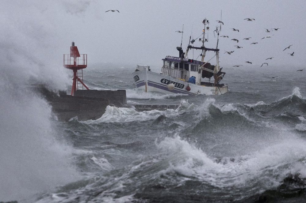 SEBUAH bot nelayan tiba di pelabuhan di Plobannalec-Lesconil, barat Perancis, pada 22 Oktober 2025, ketika ombak besar dan angin kencang melanda pantai semasa ribut Benjamin melanda kawasan itu. Foto AFP