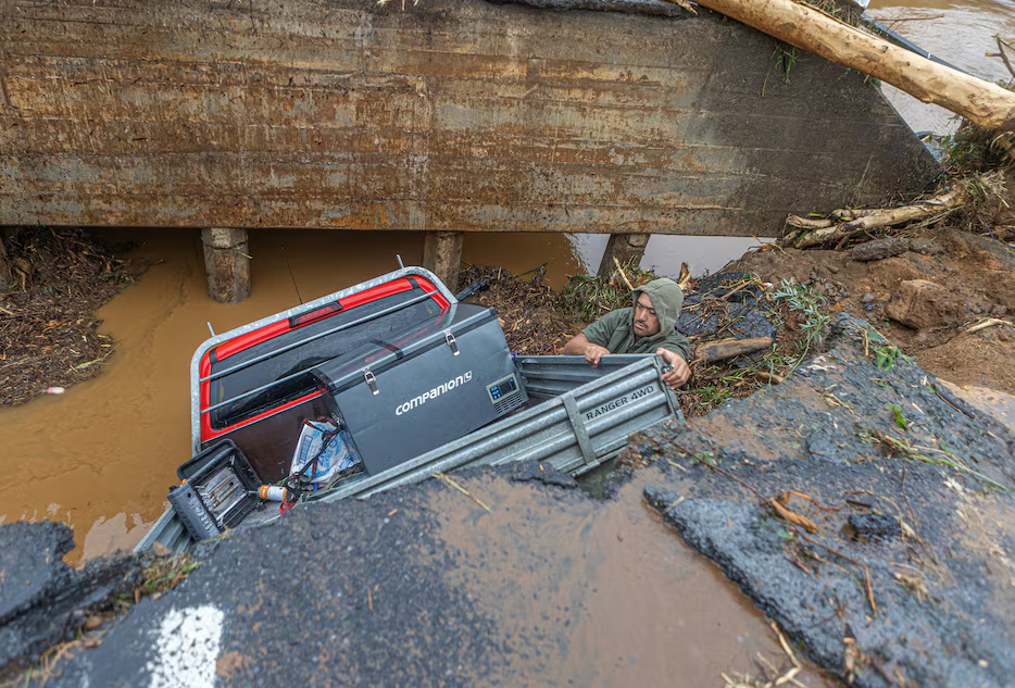 LELAKI mengambil barang dari kenderaan yang terjunam dari bahagian jalan yang runtuh susulan hujan lebat dan angin kencang di Puketotara, wilayah Waikato, New Zealand, baru-baru ini.
