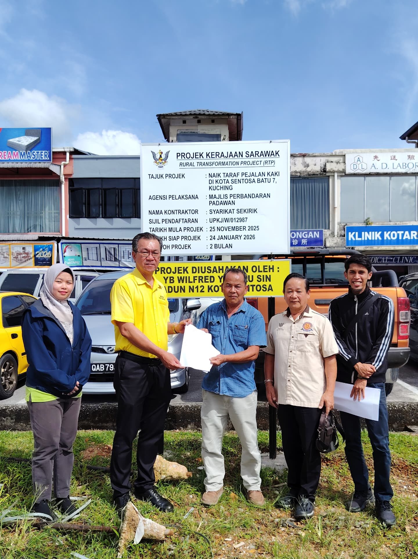 KUCHING: Ahli Dewan Undangan Negeri (ADUN) Kota Sentosa, Wilfred Yap Yau Sin hari ini mengadakan lawatan tapak serta menyerahkan Surat Setuju Terima kepada kontraktor yang dilantik, Syarikat Keririk, bagi projek Program Transformasi Luar Bandar (RTP) 2023 melibatkan naik taraf laluan pejalan kaki di Kota Sentosa.