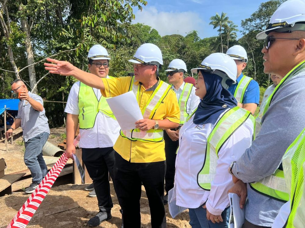 TAKLIMAT… Datuk Rubiah Wang, (dua kiri) mendengar taklimat daripada pegawai Jabatan Kerja Raya Malaysia ketika meninjau tapak pembinaan Jambatan Selampit di Lundu, semalam. Foto JAPEN Lundu
