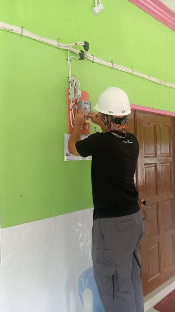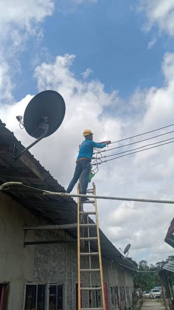 KAKITANGAN SEB sedang melakukan pemasangan bekalan elektrik di Rumah Amban Danis Libas, Sungai Antu Krian. Foto: Pusat Khidmat ADUN Kalaka