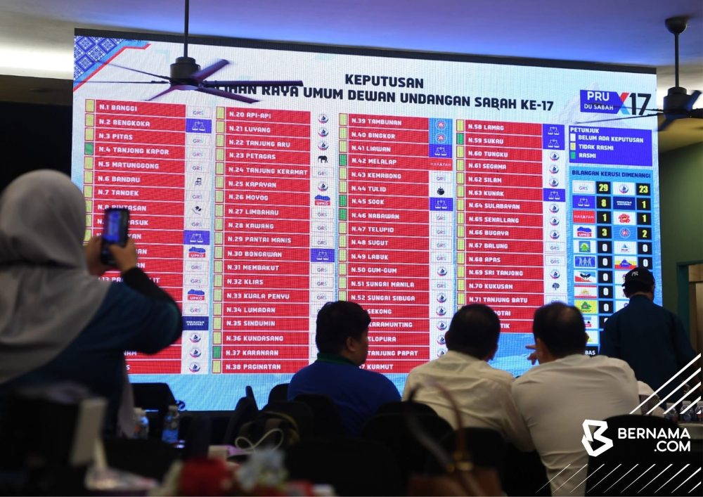 Setakat 11 malam, Suruhanjaya Pilihan Raya telah mengumumkan keputusan rasmi bagi 22 kerusi Dewan Undangan Negeri (DUN) namun difahamkan parti-parti sedang giat mengadakan rundingan di kediaman rasmi Ketua Menteri Sabah di Sri Gaya dan beberapa lokasi lain.