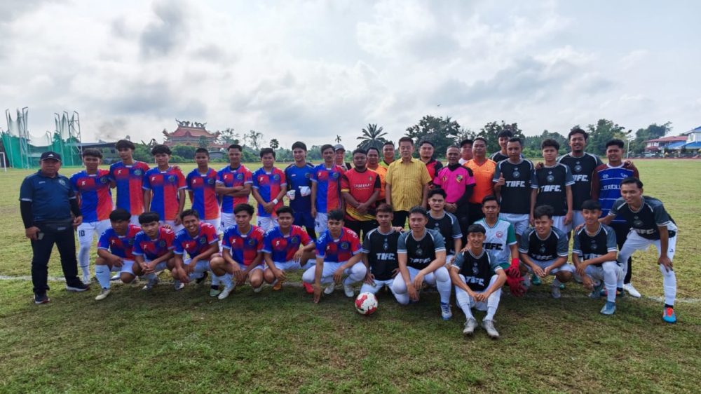 RAKAM KENANGAN… Datuk Ding Koung Hiing bergambar bersama pasukan yang bertanding di kejohanan bola sepak 9 sebelah Saberkas Meradong, hari ini. Foto Pusat Khidmat Meradong