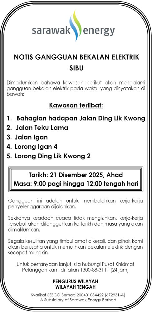 IKLAN Sabtu, 20-21 Disember 2025, SEB Notis Gangguan Bekalan Elektrik Sibu Utusan Sarawak 7 hours ago Continue Reading Previous: Jumaat, 19-20 Disember 2025, SEB Notis Gangguan Bekalan Elektrik Sarikei