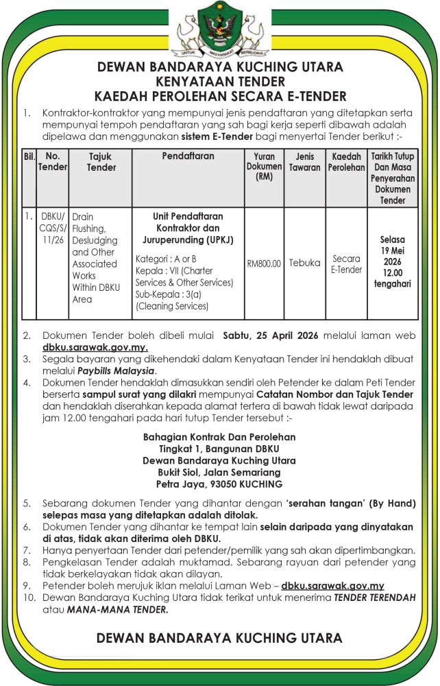 IKLAN Sabtu, 25 April 2026, DBKU, Kenyataan Tender, Kaedah Perolehan Secara E-Tender Utusan Sarawak 6 hours ago Continue Reading Previous: Jumaat, 24-25 April 2026, SEB Notis Gangguan Bekalan Elektrik Sarikei