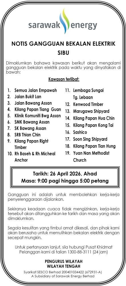 IKLAN Sabtu, 25 April 2026, SEB Notis Gangguan Bekalan Sibu Utusan Sarawak 5 hours ago Continue Reading Previous: Sabtu, 25 April 2026, DBKU, Kenyataan Tender, Kaedah Perolehan Secara E-Tender