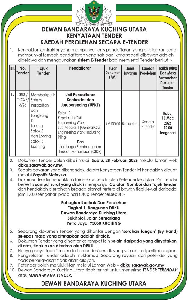 IKLAN Sabtu, 28 Februari 2026, DBKU, Kenyataan Tender, Kaedah Perolehan Secara E-Tender Utusan Sarawak 10 hours ago Continue Reading Previous: Jumaat, 27-28 Februari 2026, SEB Notis Gangguan Bekalan Elektrik Kapit